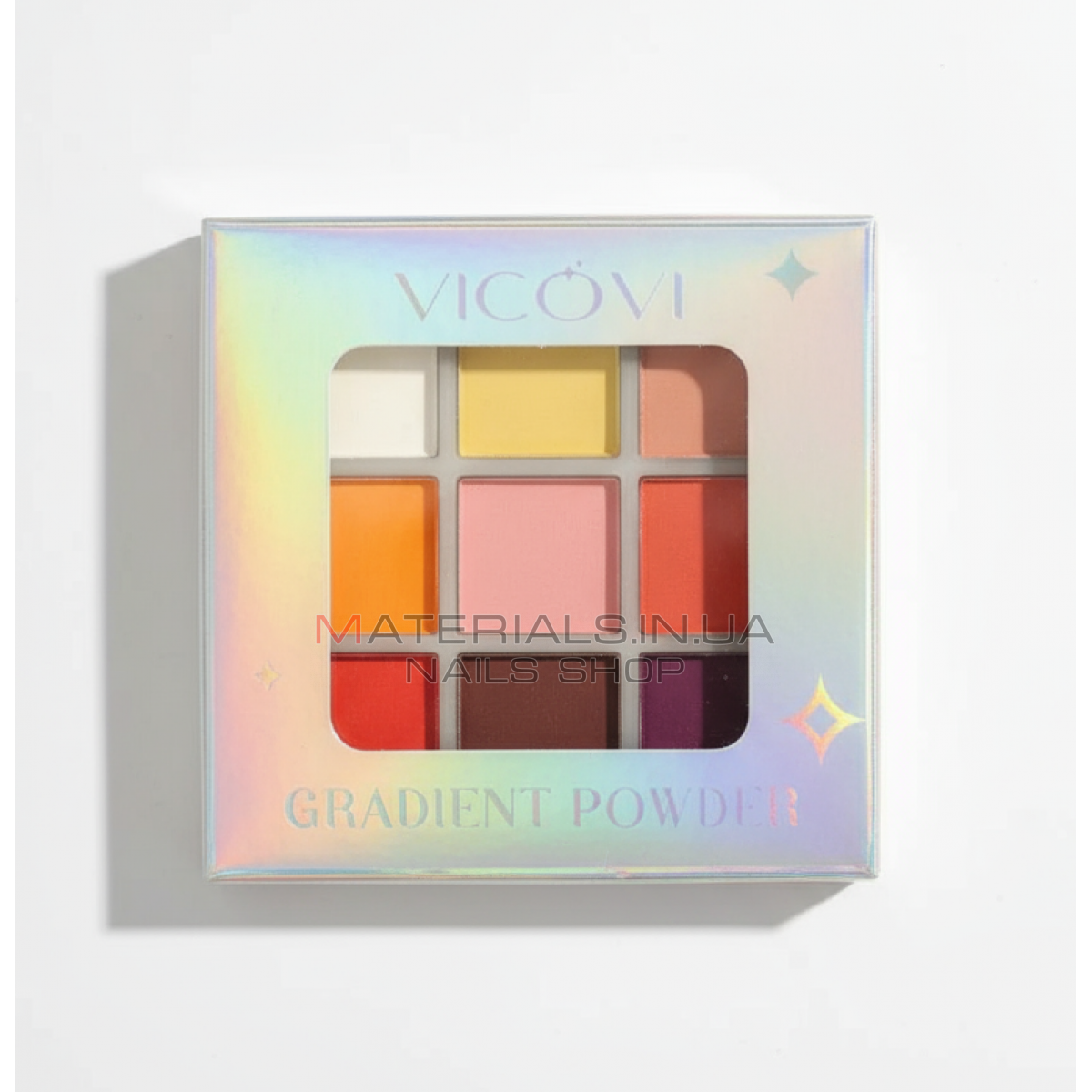 Упаковка содержит 9 оттенков пигмента, позволяющего воплотить различные идеи ногтевого дизайна.